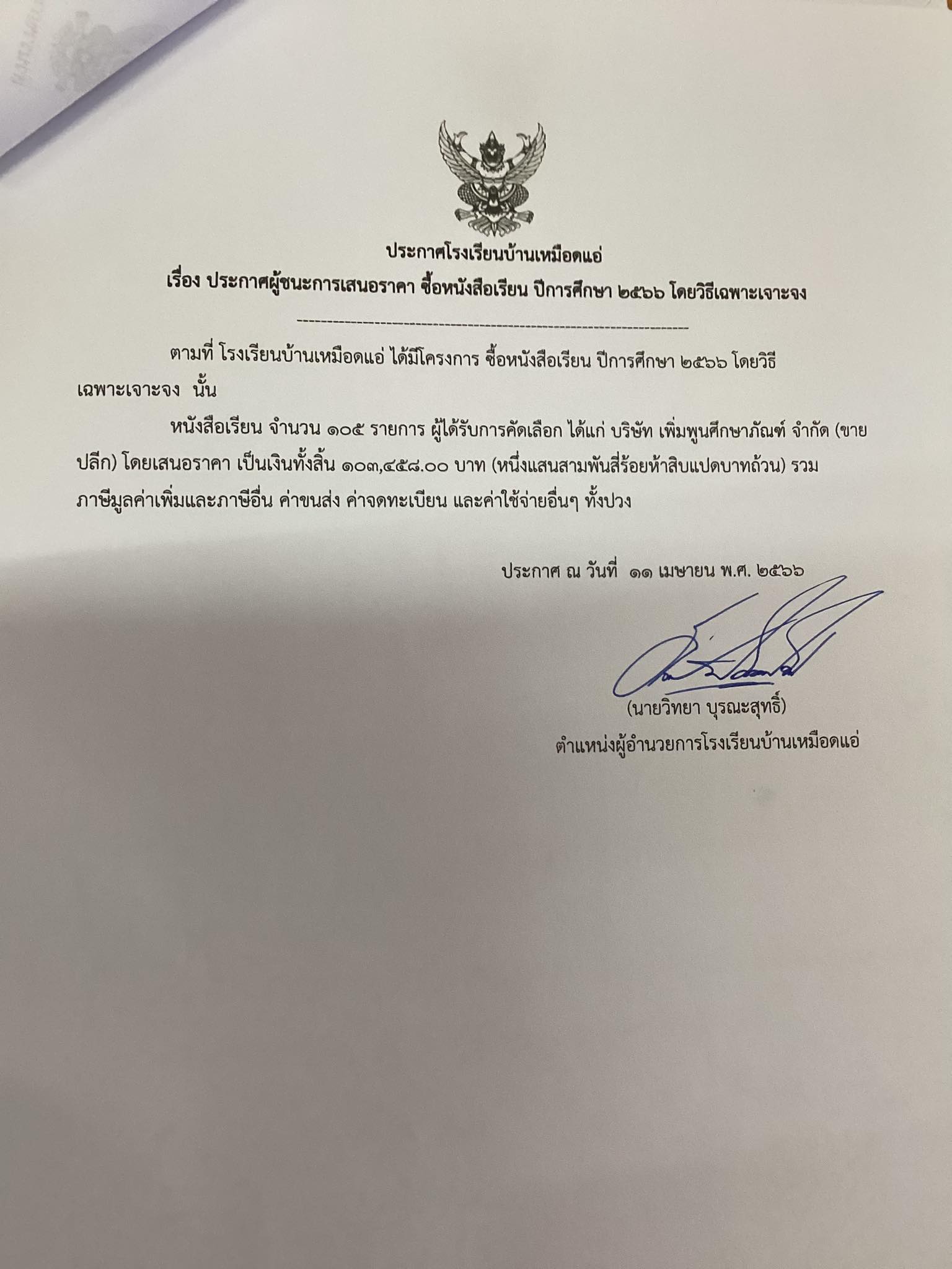 เรื่อง ประกาศผู้ชนะการเสนอราคา จัดซื้อหนังสือเรียน ปีการศึกษา 2566 โดยวิธีเฉพาะเจาะจง