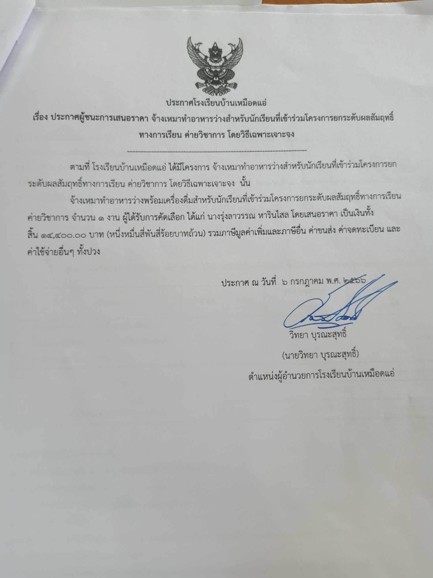 เรื่อง ประกาศผู้ชนะการเสนอราคา จ้างเหมาทำอาหารว่างสำหรับนักเรียนเข้าร่วมโครงการยกระดับผลสัมฤทธิ์ทางการเรียน ค่ายวิชาการ โดยวิธีเฉพาะเจาะจง