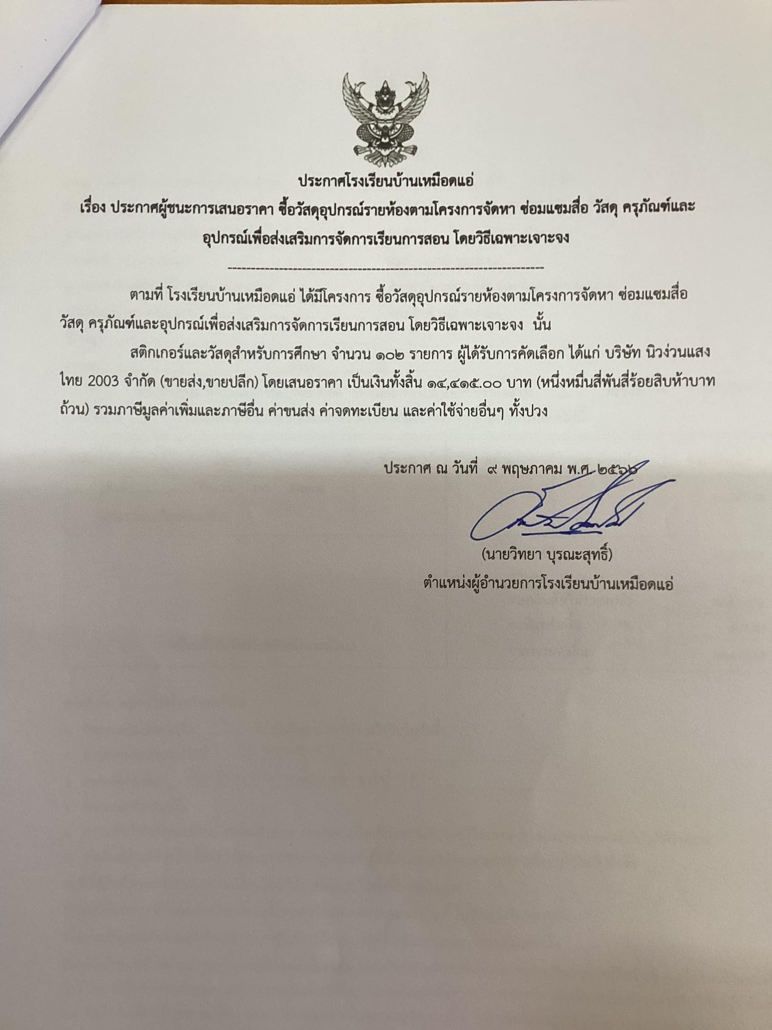 เรื่อง ประกาศผู้ชนะการเสนอราคา จัดซื้อวัสดุอุปกรณ์รายห้องเรียน โดยวิธีเฉพาะเจาะจง