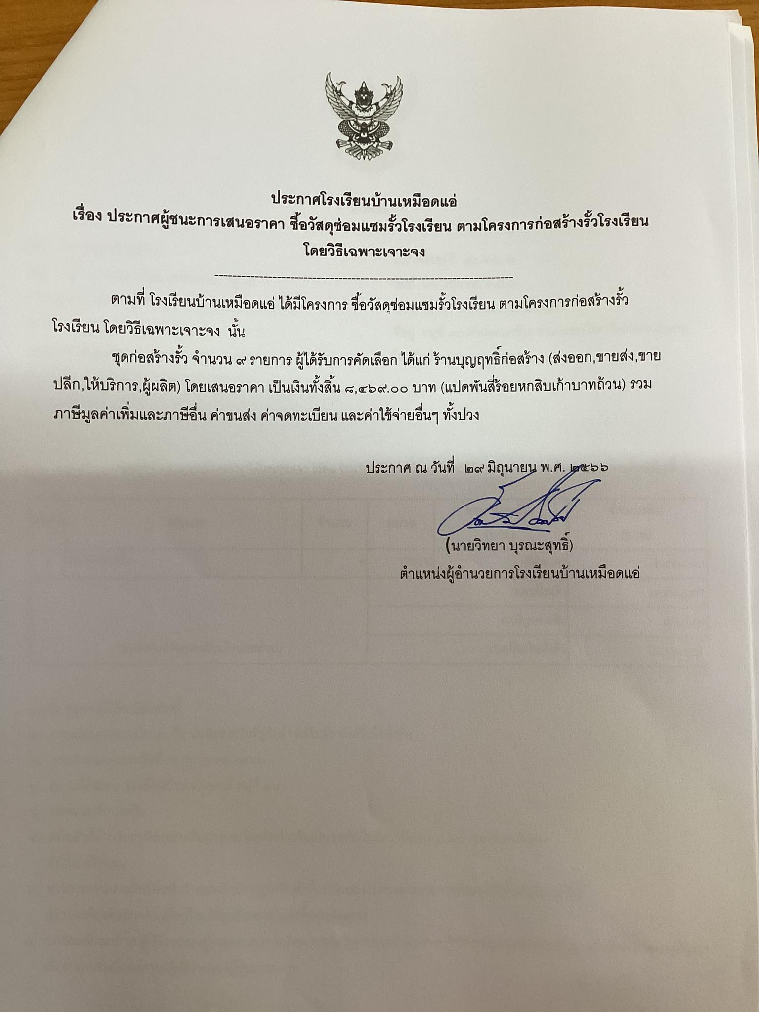 เรื่อง ประกาศผู้ชนะการเสนอราคา จัดซื้อวัสดุซ่อมแซมรั้วโรงเรียน โดยวิธีเฉพาะเจาะจง